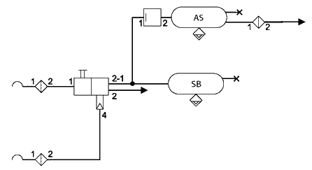 - lm ersten Fall wird nach dem Vierkreisschutzventil aus dem Nebenverbraucherkreis (Anschluss 23 oder 24 am Vierkreisschutzventil) die Druckluft für die Luftfederanlage entnommen, wobei das Vierkreisschutzventil auf bevorzugte Befüllung der Bremskreise 21 und 22 ausgelegt sein muss (Ab 1.10.1994 gesetzlich vorgeschrieben). In der Mehrzahl der Fälle ist die Luftfederungsanlage mit einem höheren Druck versehen als der Druck der Bremsanlage. Dabei wird die Druckluft zwischen Druckregler und Vierkreisschutzventil entnommen und über ein Überströmventil mit begrenzter Rückströmung (oder ohne Rückströmung), das auf einen höheren Öffnungsdruck als das Vierkreisschutzventil eingestellt sein muss, dem Druckluftbehälter für die Luftfederung zugeführt. Diese Art der Auslegung hat den Vorteil, dass kleinere Luftfederbälge und Druckluftbehälter eingebaut werden können. Zudem ergeben sich kürzere Be- und Entlüftungszeiten, da die Druckdifferenz zwischen Vorratsbehälter und Luftfederbalg größer ist.
