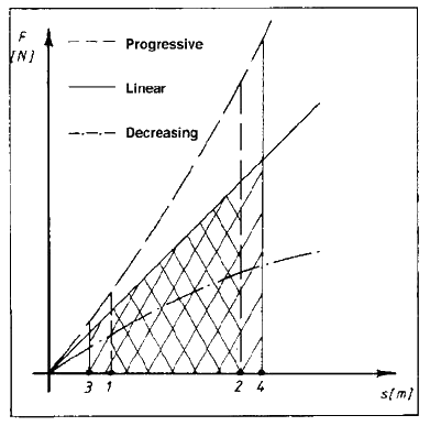 Die Federkennlinie kann eine lineare, progressive oder degressive Charakteristik haben, wobei letztere eine instabile Feder ergeben würde. Bild 1 zeigt neben dem statischen und dynamischen Arbeitsbereich einer Feder auch deren Arbeitsvermögen, welches durch die von der Federkennlinie, den Grenzen (3) und (4) und der X - Achse umrahmten Fläche dargestellt ist. Der dynamische Arbeitsbereich überlagert den statischen entsprechend den zur Verfügung stehenden dynamischen Federwegen (Strecke 1 - 3 und Strecke 2 - 4).