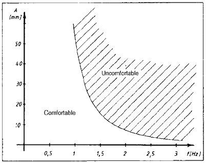 - Die Eigenfrequenz hat starke Auswirkungen auf den Fahrkomfort. Da aber der Fahrkomfort nur sehr schlecht objektiv darstellbar ist, müssen subjektive Erkenntnisse herangezogen werden, mit denen der Komfort mathematisch oder graphisch beschrieben werden kann. Man sieht deutlich, dass der von Menschen angenehm empfundene Bereich nicht nur eine relativ sehr kleine Eigenfrequenz voraussetzt, sondern auch von der Schwingungsamplitude abhängt.