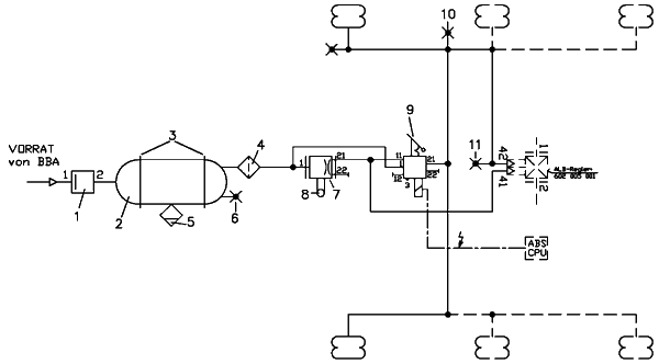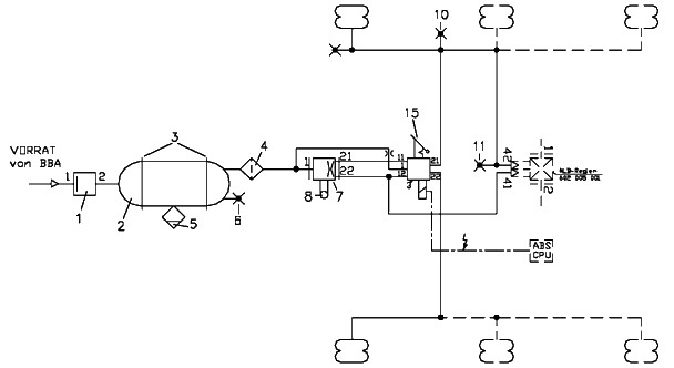 Aus Sicherheitsgründen muss die Druckluft für die Bremsanlage von der Luftfederanlage getrennt und abgesichert sein. Hierbei ist Kreis 1 und 2 (Anschlüsse 21 und 22 am Vierkreisschutzventil) immer der BBA zugeordnet.