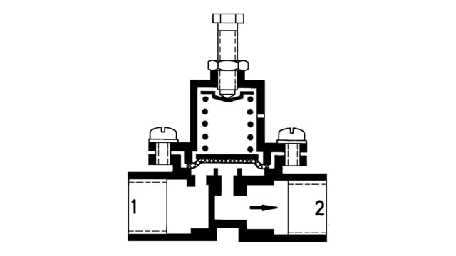 At a relatively large drop in pressure at port 2, e.g. a defect in the auxiliary circuit, air from port 1 flows into port 2, until the spring presses the diaphragm onto its sealing seat. In port 1 the protected pressure remains.