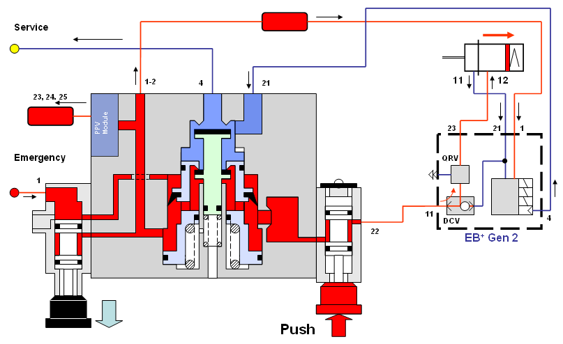 System coupled, charged, parking brake OFF (vehicle at REST or DRIVE)Service tank air consumption NOT isolated from spring brakes!